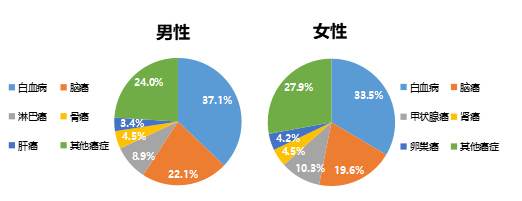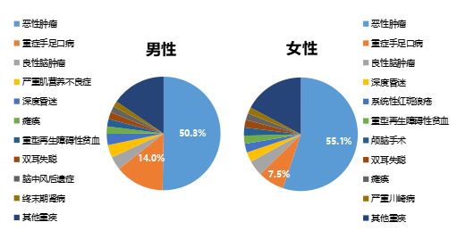 未成年人无论男女最高发的重疾为恶性肿瘤,占比超过50%;最高发的前三项重疾依次为恶性肿瘤、重症手足口病、良性脑肿瘤,三者合计占比接近70%。其中,对于恶性肿瘤,男性最高发的依次为白血病、脑癌和淋巴瘤,女性最高发的依次为白血病、脑癌和甲状腺癌。