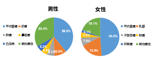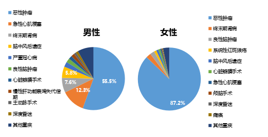 青年男性最高发的重疾为恶性肿瘤,占比达到55%;其次为急性心肌梗塞、终末期肾病,前三者合计占比约75%;青年女性最高发的重疾为恶性肿瘤,占比高达87%;其次为终末期肾病、良性脑肿瘤。对于恶性肿瘤,男性最高发的依次为甲状腺癌、肝癌和肺癌,女性为甲状腺癌、乳腺癌和子宫颈癌。