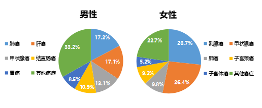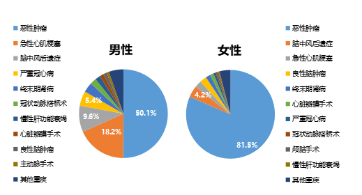 中年男性最高发的重疾为恶性肿瘤,占比约50%;其次为急性心肌梗塞、脑中风后遗症,前三者合计占比约78%;青年女性最高发的重疾为恶性肿瘤,占比超过80%;其次为脑中风后遗症、急性心肌梗塞。对于恶性肿瘤,男性最高发的依次为肺癌、肝癌和甲状腺癌,女性为乳腺癌、甲状腺癌和肺癌。