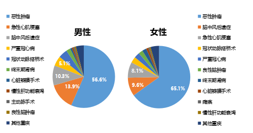 目前保险行业数据观察到的老年人经验主要为60-75岁年龄段的 “年轻老人”。该年龄段男性最高发的重疾为恶性肿瘤,占比超过55%;其次为急性心肌梗塞、脑中风后遗症,前三者合计占比超过80%。女性最高发的重疾为恶性肿瘤,占比超过65%;其次为脑中风后遗症、急性心肌梗塞,前三者合计占比超过80%。对于恶性肿瘤,男性最高发的依次为肺癌、结直肠癌和胃癌,女性为肺癌、乳腺癌和结直肠癌。从收集到的医学资料和人口统计数据可知,高龄老人的高发重疾还有严重阿兹海默病,该病占比在85岁以上男性中可达20%左右,女性30%左右。